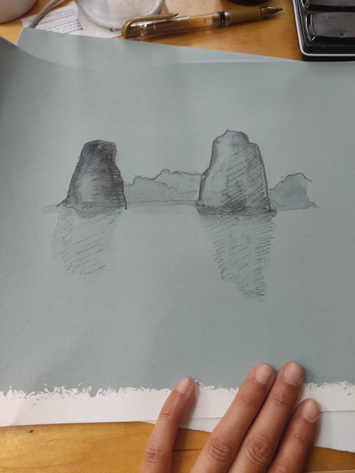 J’ai réalisé ici un décor dessiné à la pointe noire et peint à l’aquarelle sur un mur bleu gris argile.
